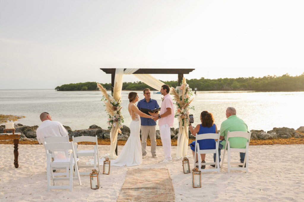 Our bamboo arbor with a floral arrangement & fabric draping makes for the most beautiful ceremony on the waterfront beach location of your choosing.